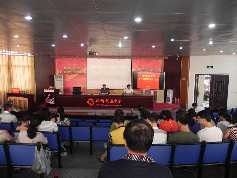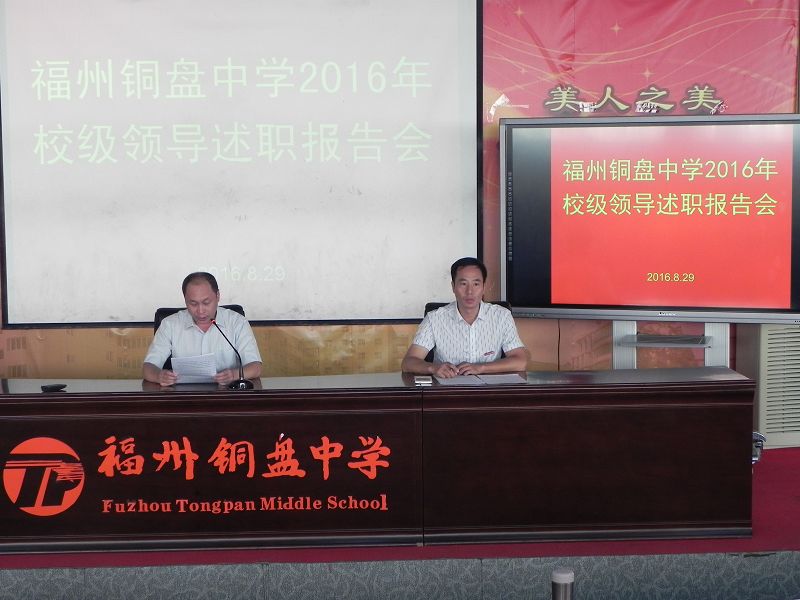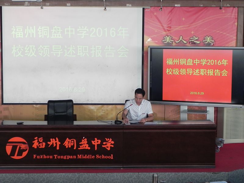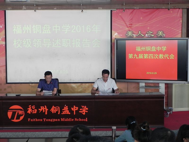 福州铜盘中学召开第九届第四次教代会发表时间:2016-08-31 13:32 福州铜盘中学召开第九届第四次教代会 2016年8月29日上午,福州铜盘中学工会举行第九届第四次教代会,由我校柳榕、邢世涛、林先全三位副校长分别做2015-2016年度述职报告,全体代表出席会议并评议。 柳榕副校长对本学年度由他分管的教育管理和教科研工作进行了认真细致的总结,邢世涛副校长对本学年度由他分管的德育工作进行了认真细致的总结,林先全副主席对本学年度由他分管的行政和后勤总务及校工会工作进行了认真细致的总结,同时他们还虚心指出各自存在的不足之处和今后努力好和改进的方向及其措施。代表们还讨论并填写了本届教代会提案,为学校新学年建设共献发展大计。会议历时一个小时,大会会场气氛民主和谐。会议由我校工会主席林先全副校长主持。